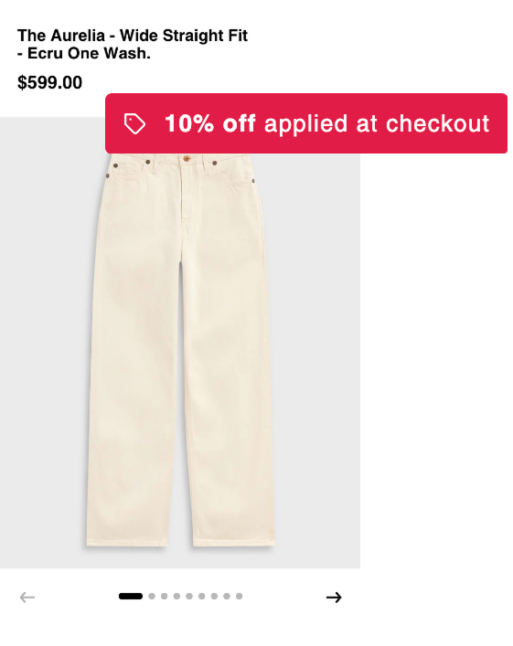 Discount at Checkout enables you to only apply discounts when the customer reaches the checkout. Communicat discounts throughout the buying journey and apply them at the checkout.
